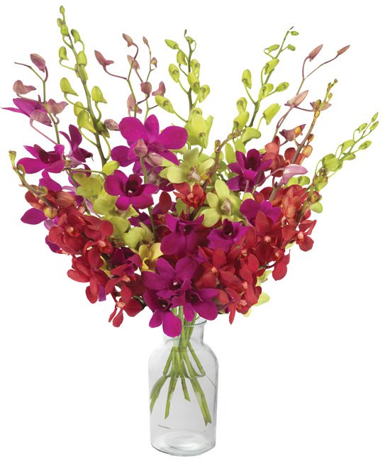 Three varieties of exotic orchids sent straight from our grower in Thailand send your wishes in a fashion that just doesn’t get any finer. Red mokaras, jade dendrobiums, and purple Sabin orchids fan out in a colorful celebration, standing tall in our silver metal urn. Truly a sight to be seen and enjoyed.