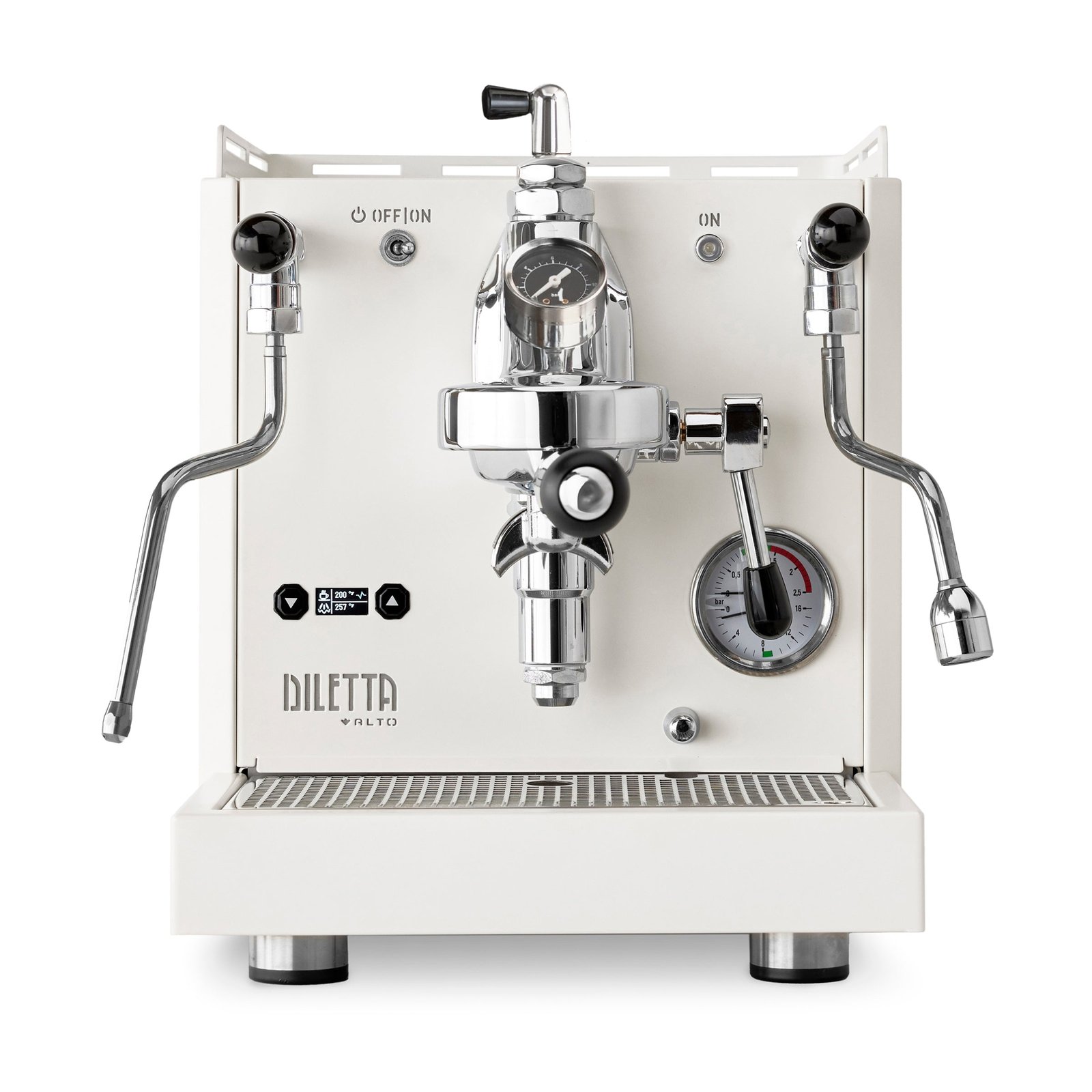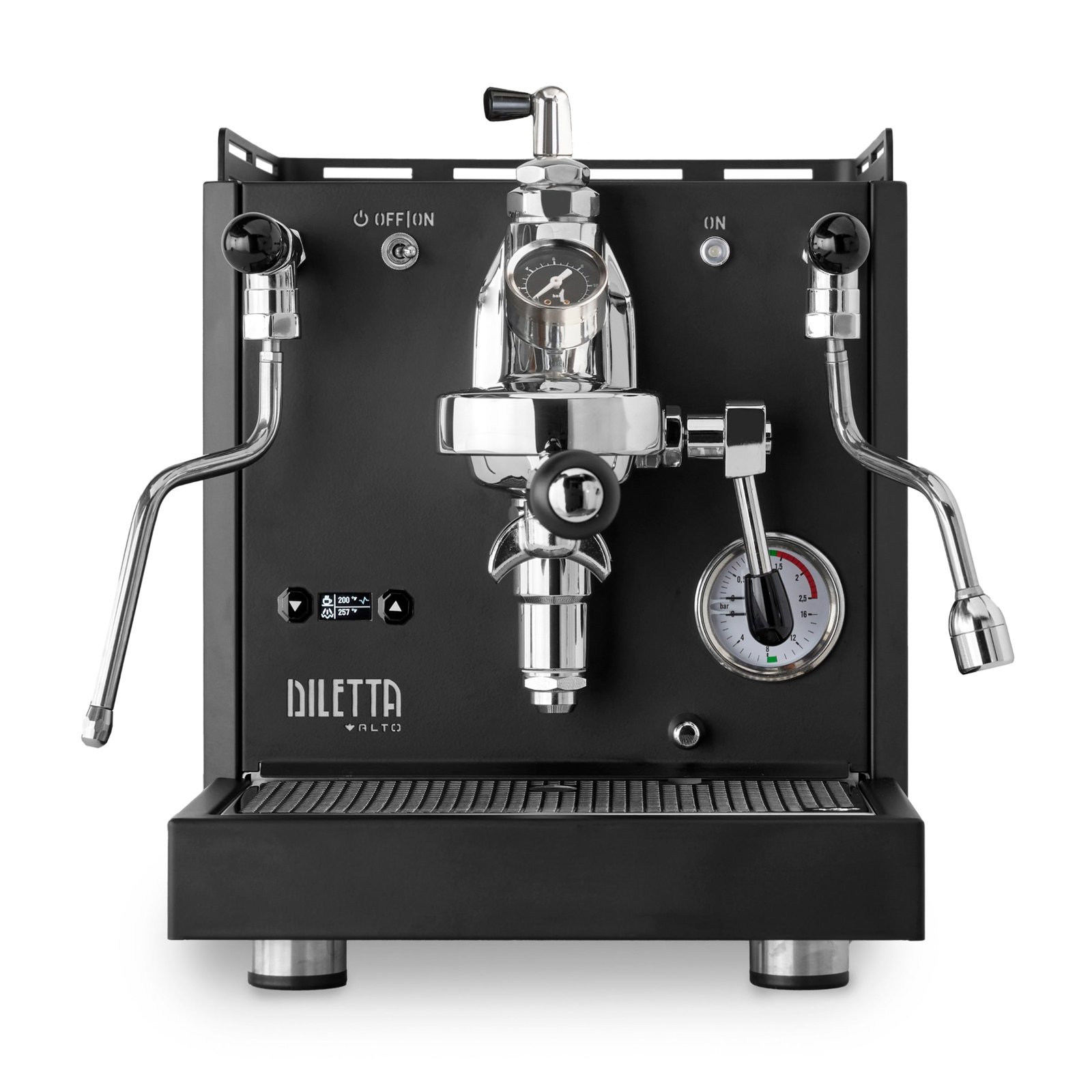 The Diletta Alto Espresso Machine with Flow Control puts espresso creation at your fingertips. An upgraded version of the standard Diletta Alto, this version adds manual flow controls to the PID-equipped dual boiler formula. Only an inch wider than the original Diletta Bello, the Alto still manages to fit a 0.75L brew boiler and a 1.6L steam boiler in its counter-friendly case. Inside, all the user-friendly features found in the Bello+ make an appearance, including favorites like on-the-fly temperature controls, automatic shot timing, programmable preinfusion, and low power eco-mode. Experienced baristas will also love the Alto’s upgrade to sprung valves with tap-to steam controls, and a top-accessible OPV valve for brew pressure adjustment. The addition of flow controls and a group pressure gauge lets you manipulate the extraction profile of your shots in real time, and opens up brew techniques otherwise impossible on a regular home machine.