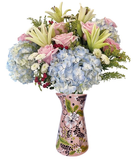 Hyadrage, Lilies, and Roses are a treasure of the lunar new year to bestow upon your very own Valentine. This bouquet of rich hues and transcendent colors are beautifully highlighted in an array of stems. To complete the ensemble we’ve offered it in our ceramic floral pitcher or gold plated vase.