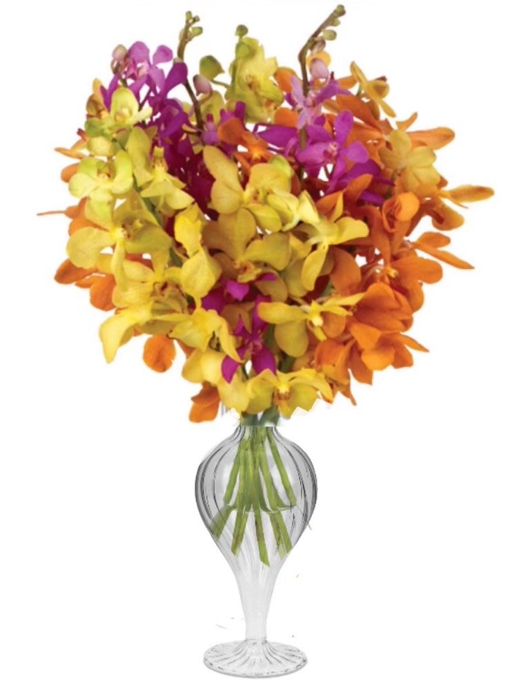 Luscious sprays of vivid orange and bright yellow mokaras are combined with a gorgeous gathering of purple calypso orchids, creating a captivatingly fresh new look for summer gift-giving. To complement the distinctive shape of the exotic orchid blossoms, we’ve chosen a contemporary, striped ceramic vase. This bouquet has an exceptionally long vase life and would make a marvelous, mood-setting centerpiece for a summer party, indoors or out.