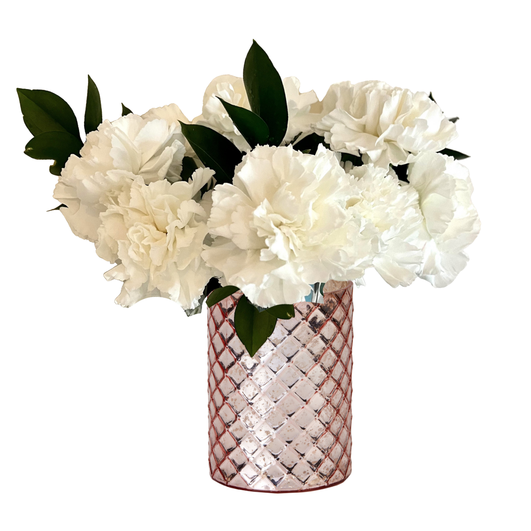 An elegant display of White Carnations with deep Green Ruscus for all of life’s events. Beautifully filling our white vase, it is a traditional and timeless look.
