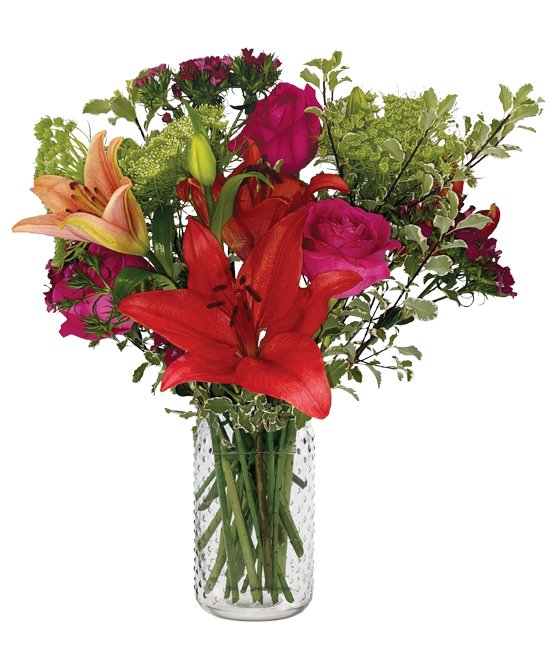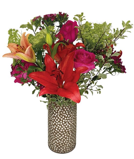 A gift that arrives at one’s doorstep is always appreciated. This bouquet is guaranteed to be remembered for many years to come. The vibrant bright colors of red and hot pink complemented by the soft greens all pleasantly displayed in our hearts adorned vase. This bouquet is simply magnificent.