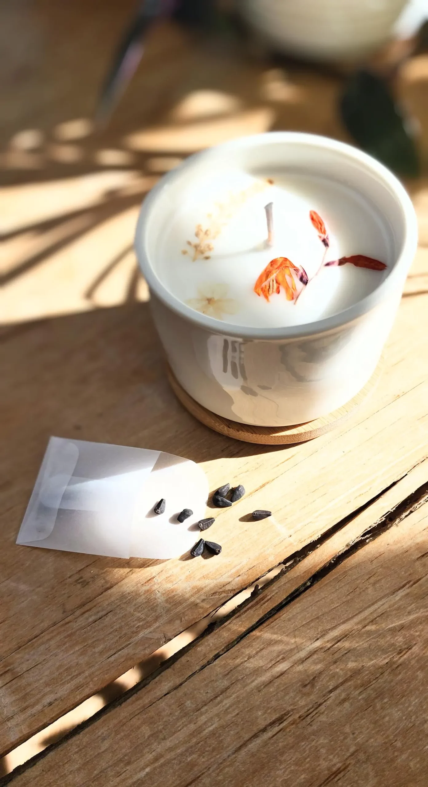 Accompanied by Cosmo flower seeds. Once the candle is at its end, remove the cork from the bottom of the ceramic vessel, “Voilà” into a flower pot it transforms. Plant your Cosmo seeds and watch flowers come to life!