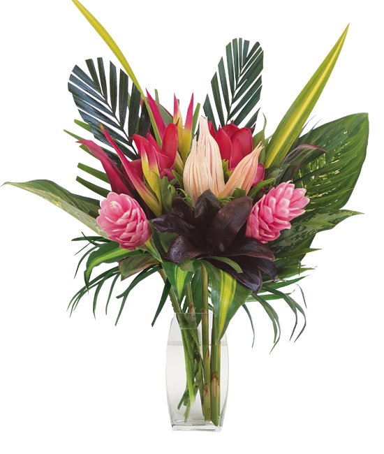 A bouquet aglow with tropical beauties is a grand way to warm someone’s heart and home. A surprise from warmer climates all set against a lush backdrop of different leaves of palms. Creating a true paradise oasis.