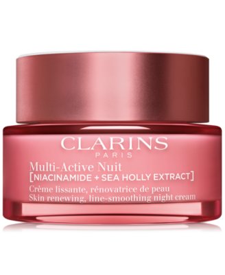 Clarins Multi-Active Night Moisturizer helps visibly smooth lines, refine pores and strengthen the moisture barrier for a healthy glow. It is powered by 2% niacinamide plus Sea Holly extract. The melting texture energizes skin.
