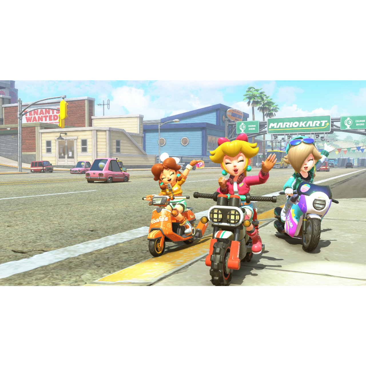 Race along grassy plains, bustling cities, wide-open waters, big ol’ volcanos, and more—plus everything in between. Play together on the same system**** with up to 4 players or go for the top spot in online*** races with up to 24 players.