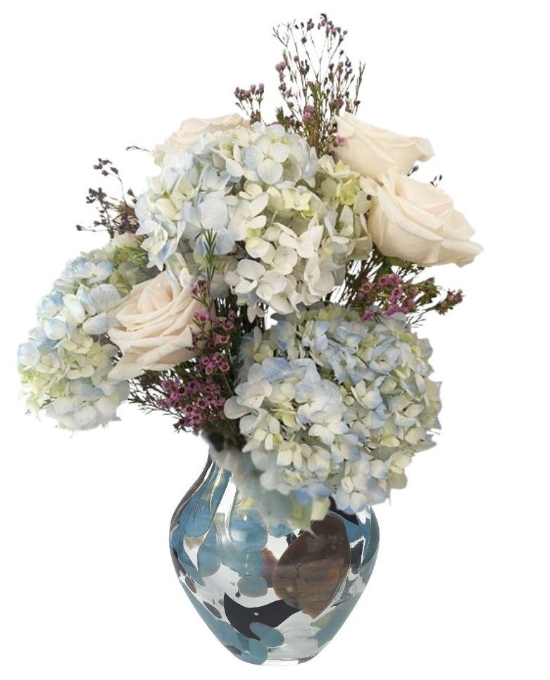 The people of Sweden, Finland and Norway used to place special lights in their windows to welcome visitors and add warmth to their surroundings. Our Nordic Winter Bouquet brings the same light and warmth into any home. Our exclusive vase with its tan edging is home to a heady harvest of snow-white roses, blustery blue hydrangea, and pinkish-purple waxflower.