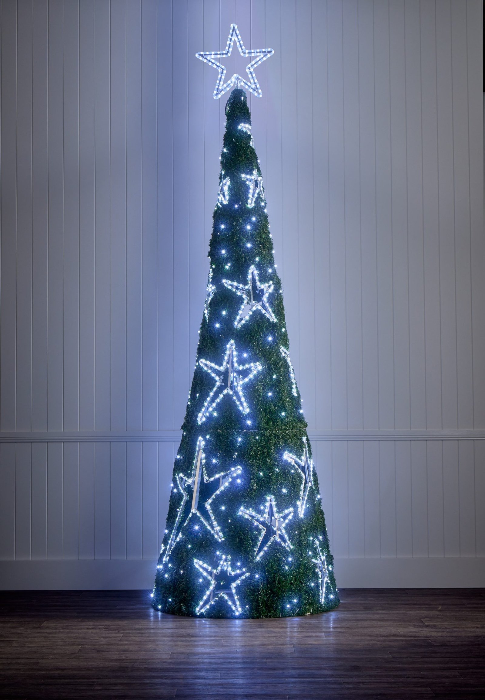 Our star cut-out cone trees are combined with an aluminium cone frame, light-up tree top star and built in LED lighting making the design a “plug and play” solution for any Christmas display. The combination of white LED star cut-outs and contemporary foliage creates a truly elegant look.