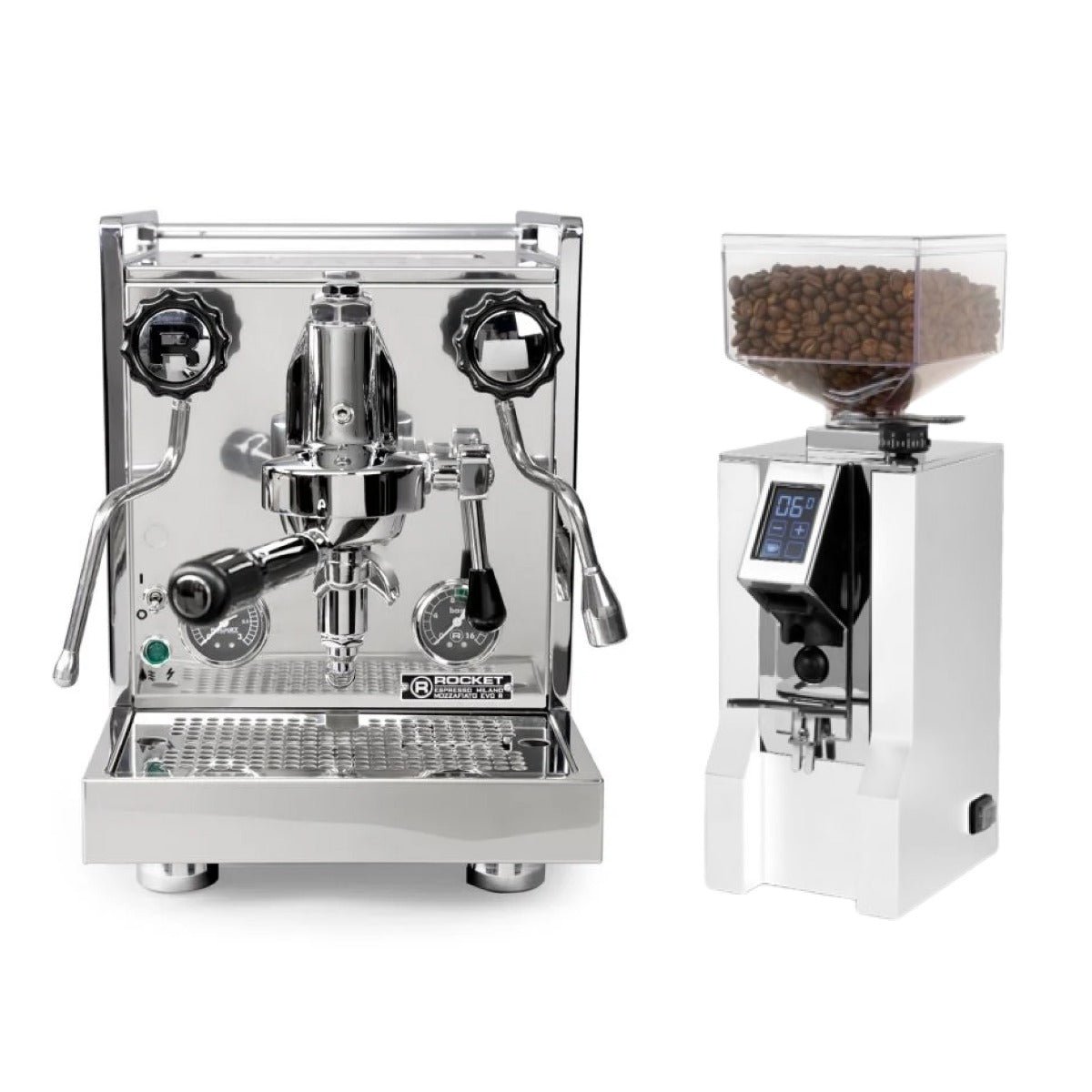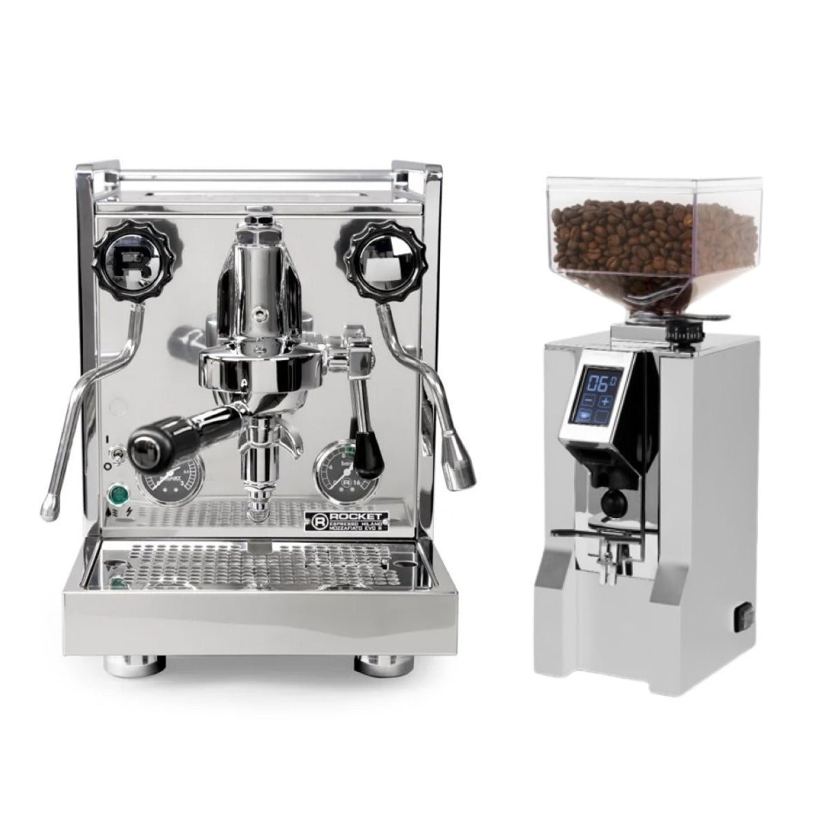 Make your home espresso setup something special with the Rocket Espresso Mozzafiato R Mignon XL Bundle. Carefully selected to make the most of your home cafe, this espresso bundle includes the breathtaking Rocket Espresso Mozzafiato Timer Evoluzione R, a machine packed with prosumer features like an E61 brew group, PID temperature control, and a powerful 1.8L heat-exchange boiler for simultaneous brewing and steaming. Paired to match is the Eureka Oro Mignon XL; an ultra fast 65mm espresso grinder with touchscreen-controlled timed dosing, silent grinding, and stepless grind adjustments for high-accuracy espresso. Together, this combo will have you brewing and steaming like a professional for years to come.