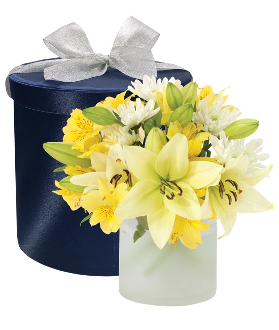 The beloved harbingers of the season, fragrant lilies the color of sunshine announce that summer has finally arrived. And the announcement becomes even brighter when white cremons and yellow alstroemeria share in the show. The perfectly arranged bouquet arrives situated in our 5″ frosted cylinder vase, delivered inside our navy hatbox topped with a silver bow for the ultimate gift presentation.