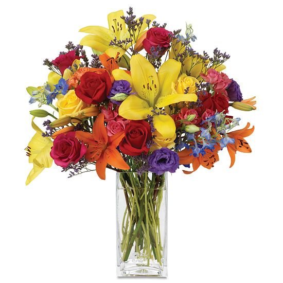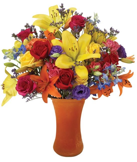 With so many gorgeous flowers to choose from this time of year, why pick just a few when you can have them all. Truly the grandest of summer bouquets, we’ve joked that this symphony of seasonal blooms includes everything but the kitchen sink. Red and yellow roses, orange spray roses, double bloom purple lisianthus, orange and yellow lilies, blue delphinium, dark purple limonium, and hot pink roses – yes, the gangs all here! And the opus earns a standing ovation in our frosted citrus orange summer vase.