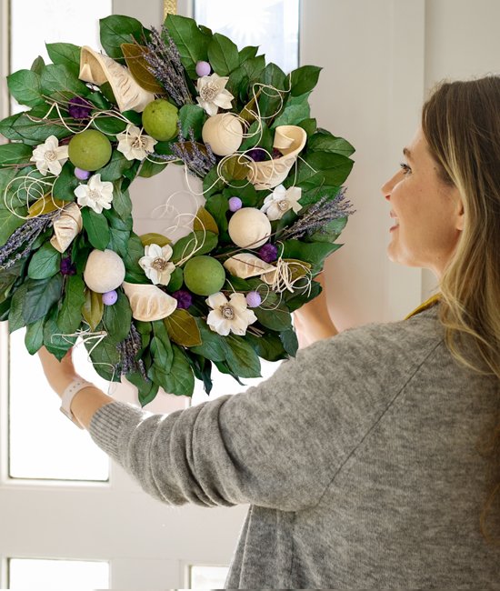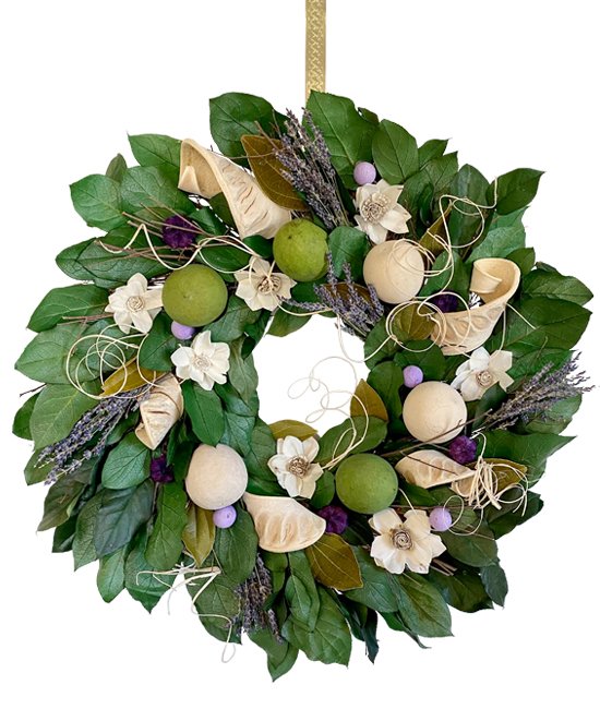For centuries, lavender has been enjoyed for its many positive effects, all celebrated here in our beautiful USA-made wreath. Recalling country cottage décor, a grapevine base is blanketed with lavender, Elephant ear, pal pods, curly ting ting, salal leaves, birch, sola gangote flower, bellini and paras pods all tied together with a soothing aromatic mixture of French Lavender, Chamomile, Creamy Sandalwood and Vanilla.