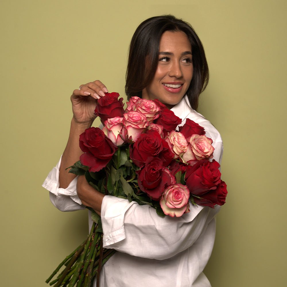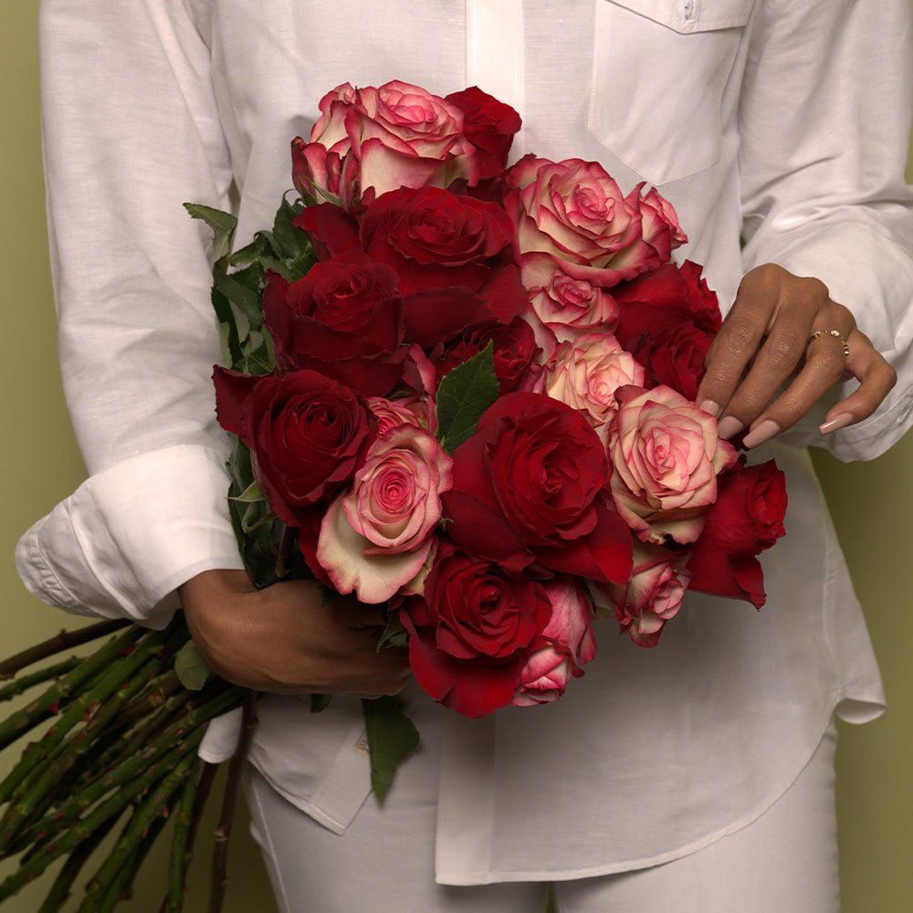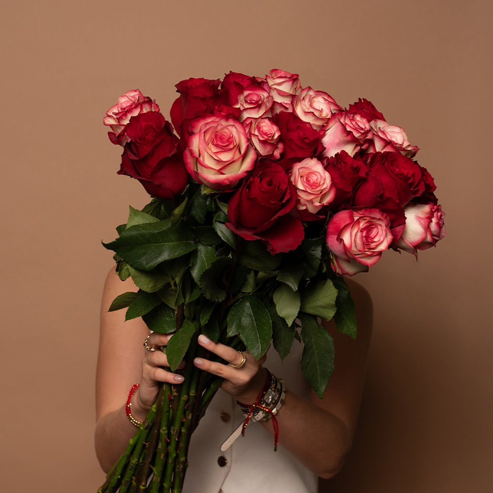 Have you decided on a composition of red roses? But how to get them as soon as possible and admire their beauty? It’s simple, order delivery of this bouquet from Rosaholics. Our expert florists are on hand to guide you through selecting the perfect bouquet. They will take the time to understand your preferences, helping you to choose the ideal combination of colors, sizes, and varieties to create a stunning bouquet that is uniquely yours. And if you have already decided on the choice of bicolor roses of red and white, you just need to clarify a few details about delivery, and that’s it.