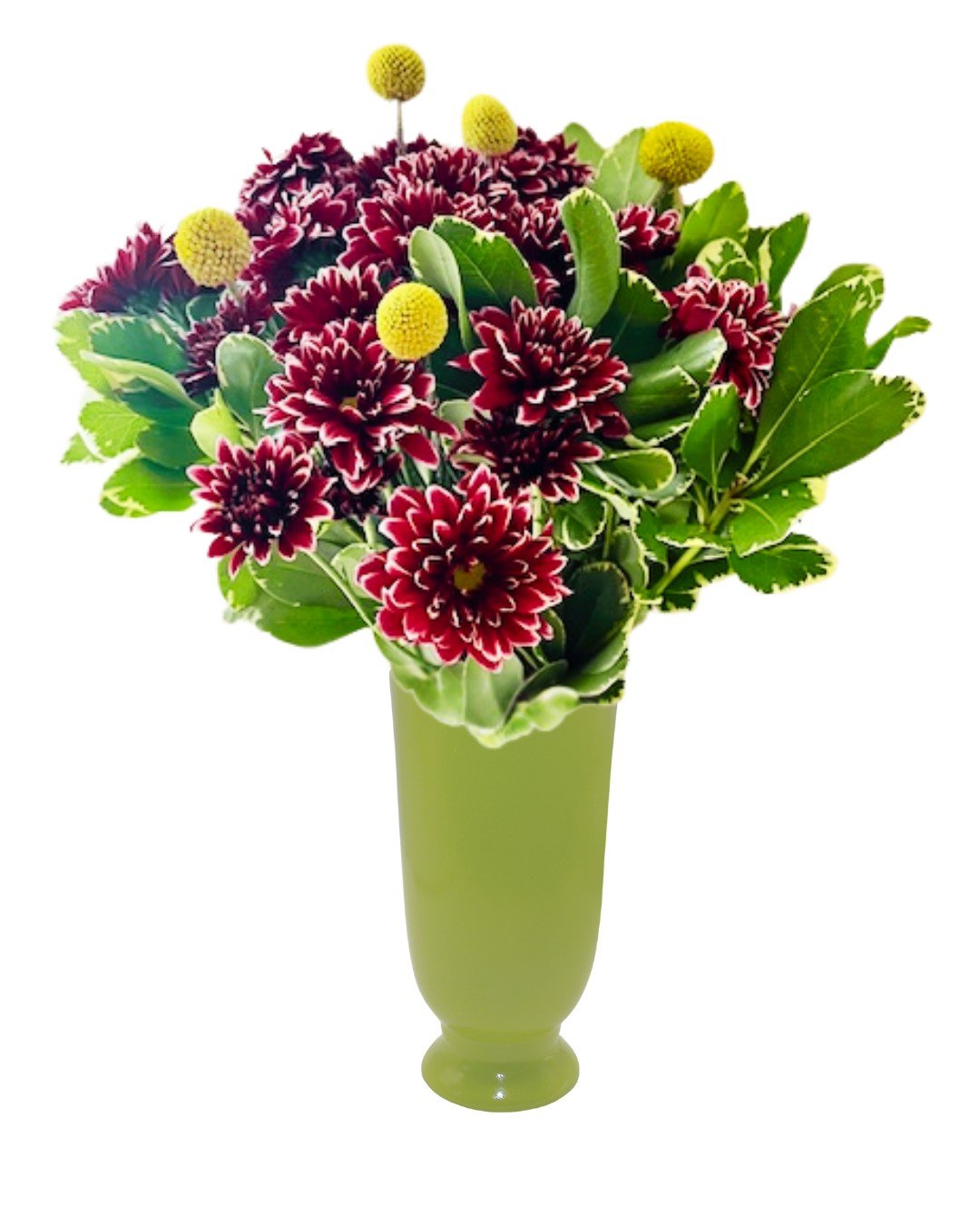 Pompon daisy amethysts & Yellow Poms! Invoking nature’s best of beauty, grace & power with its dark purple shade, this bouquet just makes you smile. The added yellow Poms pave the way for bouquet creativity! A long-lasting flower combination to be enjoyed by anyone.
